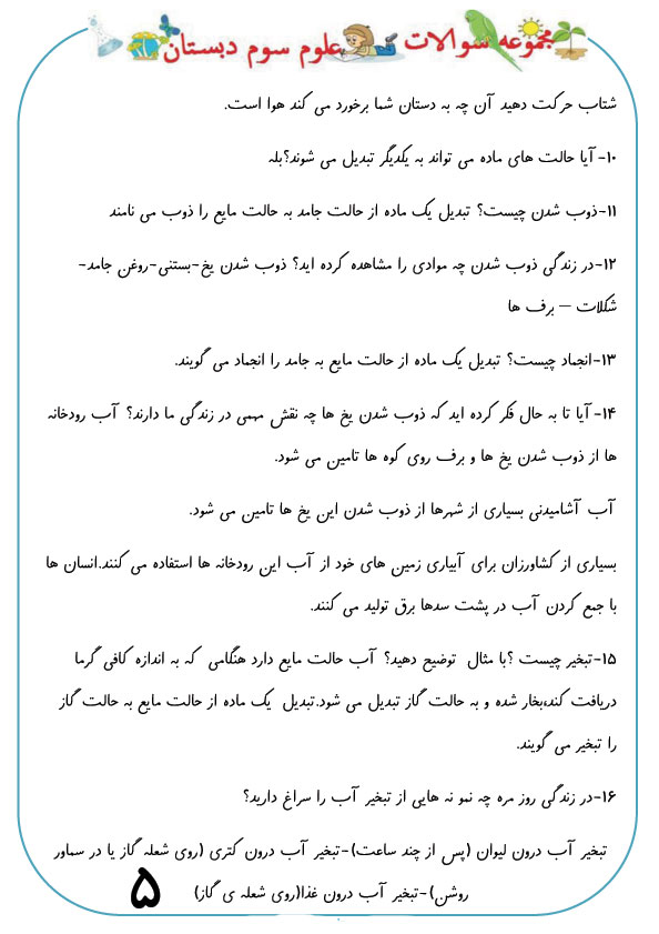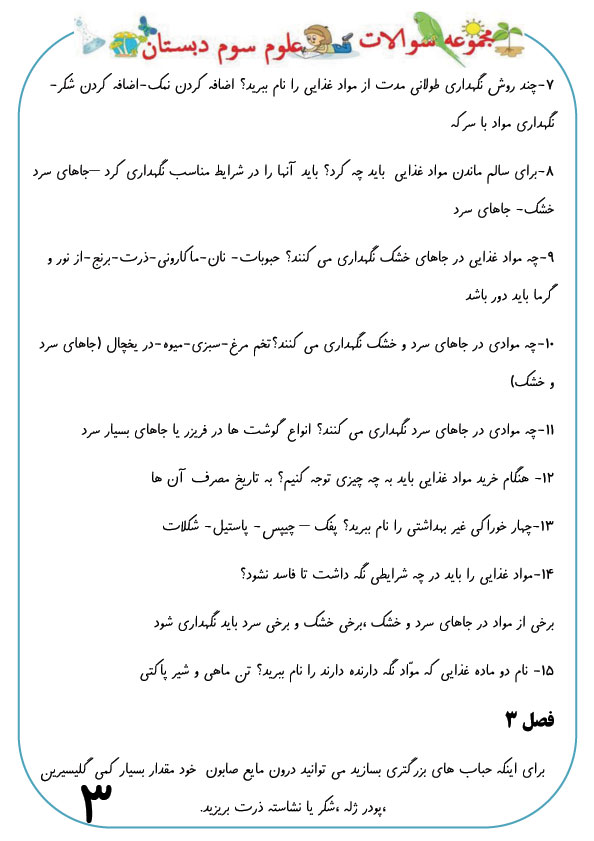 مجموعه سوالات علوم سوم ابتدایی،فصل10-11-12