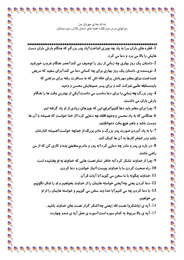 پسر گلم برای استفاده از سوالات درس ششم هدیه های آسمانی بر روی فایل زیر کلیک کن و سوالات را دانلود کن.